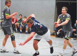 Spradows Kreisläufer Frederic Iffland hat zwei Gegenspieler des TSV GWD Minden III stehen gelassen und versucht, noch zum Torabschluss zu kommen. Iffland markierte beim 19:18-Sieg gegen die Mindener drei Treffer. Fotos: Lennart Lagmöller