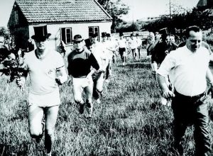 Symbolisch zu Grabe getragen: 1962 fand letzte Feldhandballspiel auf dem alten Spradower Sportplatz statt. Die Spieler trugen Zylinder oder schwarze Hüte, Spielerführer Gerd Samson (l.) vom BTW Bünde trug einen Blumenstrauß auf das Feld. Foto: Privat