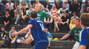 Gunnar Heise (am Ball) und Torben Sturhan (rechts) haben mit der HSG Spradow einen zu keinem Zeitpunkt gefährdeten Derbysieg gegen die SG Bünde-Dünne eingefahren. Fotos: Lennart Lagmöller