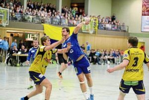Auf den Halbpositionen im Rückraum alleine für das Torewerfen verantwortlich: Spradows Till Orgel, hier vor Sebastian Meier, gelangen gestern Abend beim deutlichen und verdienten 27:20-Derbysieg der HSG gegen den CVJM Rödinghausen acht Tore.