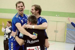 Die Zwillinge Malte und Daniel Langer feiern mit Trainer Markus Hochhaus das Ende der Derby-Durststrecke.