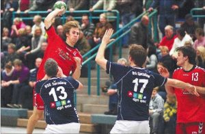 Johann Steinmeier (am Ball) zieht aus dem Rückraum einfach mal ab. Daniel Overlack (Nummer 13) und Daniel Langer stellen sich dem vierfachen Torschützen der SG Bünde-Dünne in den Weg. Rechts schaut Tobias Paffrath zu. Foto: Lennart Lagmöller