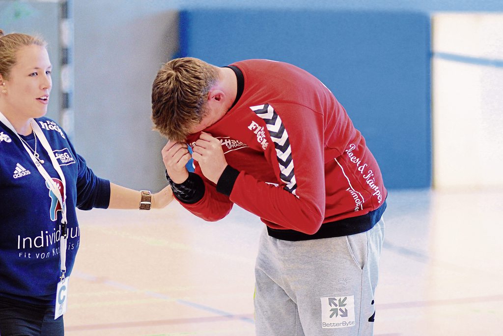 Die Anspannung ist gewichen: Spradows Torhüter Daniel Habbe (rechts) vergießt nach dem Sieg und dem damit verbundenen Klassenerhalt Freudentränen und versteckt sich unter seinem Trikot, während Physiotherapeutin Carolin Seymer sich um ihn kümmert.