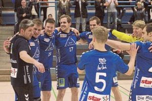 Trainger Markus Hochhaus(links) bildet nach dem ersten Sieg als HSG-Trainer einen Jubelkreis mit den Spielern. Fotos: Thorben Lippert
