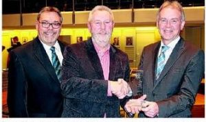 Händedruck: Horst Droese (Mitte), Vorsitzender der HSG Spradow, bekam vom Bünder Bürgermeister Wolfgang Koch (r.) den Pokal für das sportliche Lebenswerk überreicht, worüber sich auch der Stadtsportverbandsvorsitzende Martin Lohrie (l.) freut.