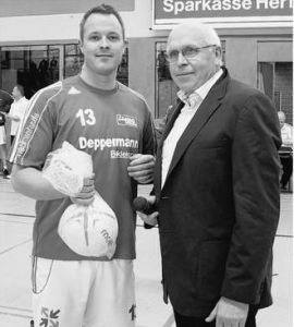 Ehrung des Bezirksliga-Meisters: Aus den Händen von Staffelleiter Friedhelm Krietemeyer (r.) erhielt der Mannschaftskapitän der HSG Spradow, Daniel Overlack (l.), einen neuen Spielball und die besten Glückwünsche. Fotos: Ulrich Finkemeyer