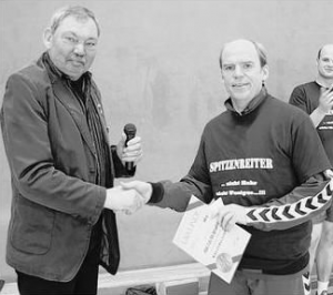 Ehrung des Kreismeisters: Herbert Wehrenbrecht (l.), Vorstandsmitglied des Handballkreis Bielefeld-Herford, überbrachte im Namen des verhinderten Staffelleiters Ralf Kipp die Glückwünsche an den Mannschaftskapitän der HSG Spradow II, Timm Eikötter (r.).