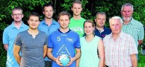 Repräsentieren den Verein: Christian Heiter (Spielwart, hinten v.l.), Thomas Peitzmeier (Schiedsrichterwart), Tim Koebke (Jugendtrainer und Spieler der 1. Mannschaft), Rene Grohmann (Teammanager), Horst Droese (Vorsitzender und Geschäftsführer), Julian Brandt (Jugendkoordinator und Co-Trainer der 1. Mannschaft, vorne v.l.), Jan Frederik Koebke (Spieler der 1. Mannschaft), Carolin Seymar (Physiotherapeutin) und Horst Mischok (Ehrenmitglied). Foto: Reiz