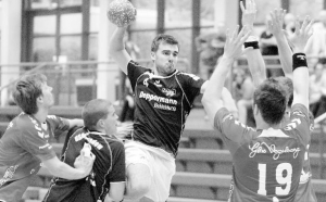 Seltene Durchschlagskraft aus dem Rückraum: Dimitri Rausch ist hoch gestiegen, sieht sich aber zwei Löhner Abwehrspielern gegenüber. Sein Teamkollege Sören Schulz wird derweil von HSGLO-Neuverpflichtung Thorsten Bergmann (links) bearbeitet.Fotos: Sebastian Picht
