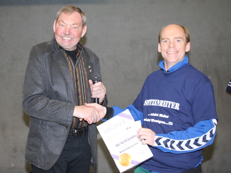 Reserve-Kapitän Timm Eikötter (rechts) bekam eine Urkunde von Herbert Wehrenbrecht (Rechtswart des Kreises) für die A-Liga-Meisterschaft der HSG II. Fotos: Christina Ueckermann