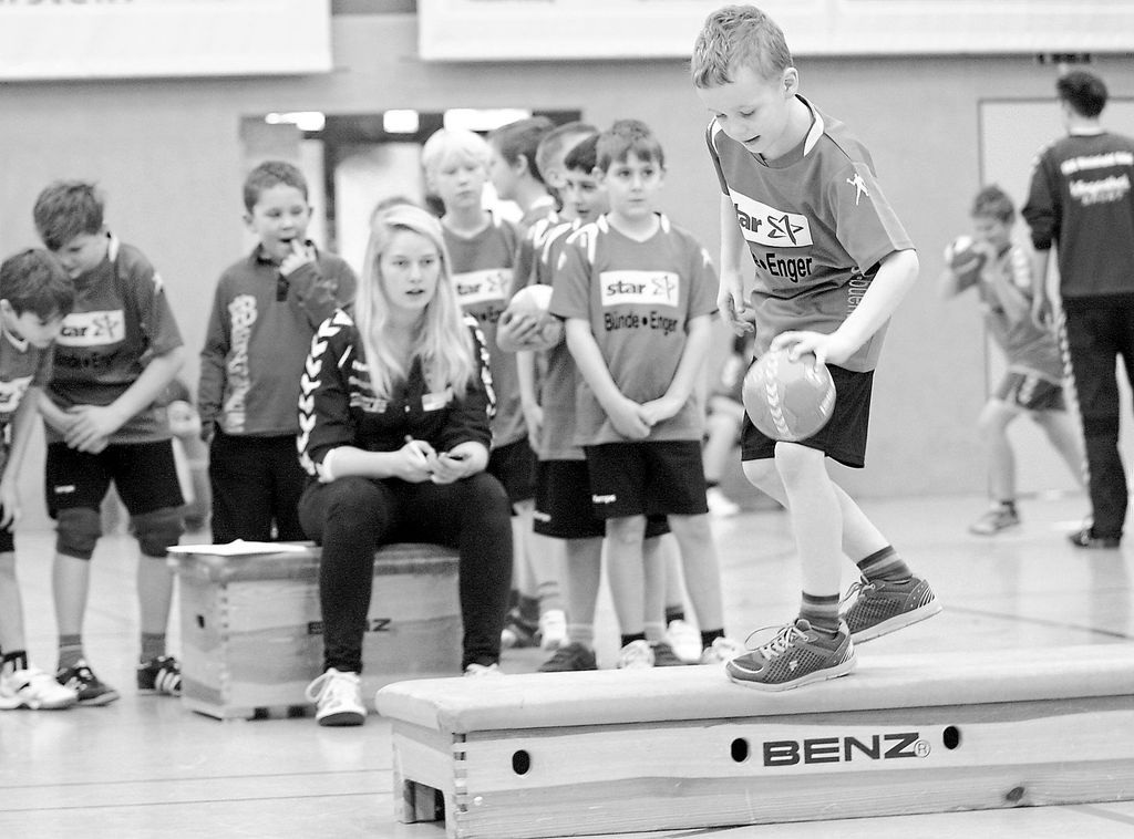 Unter Beobachtung: Tim Frobieter von der E-Jugend der HSG Spradow (am Ball) hat sich beim Vielseitigkeits-Wettbewerb in der Sporthalle der Gesamtschule Rödinghausen nicht nervös machen lassen und seine Aufgabe souverän gelöst. Foto: Markus Bergmann