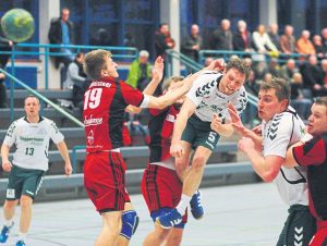 Jan Frederik Koebke hat abgezogen, anchdem ihm Teamkollege Frederik Iffland (2. von rechts) den Weg frei geräumt hat. Daniel Overlack(links) beobachtet diese Szene beim 25:33-Sieg der HSG Spradow gegen den TuS Nettelstedt II. Foto:Picht