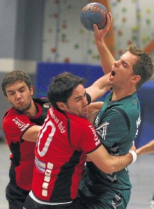 Jannik Grebe (links) und Mathias Bertelt stoppen den Spradower Malte Langer im Angriff. Fotos: Sebastian Picht