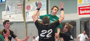 Spradows Mario Myilus steigt höher als seine Gegenspieler von der HSG Detmold/Hiddesen. Zwei Treffer gelangen ihm beim 25:14-Erfolg seiner Mannschaft. Foto: Lennart Lagmöller