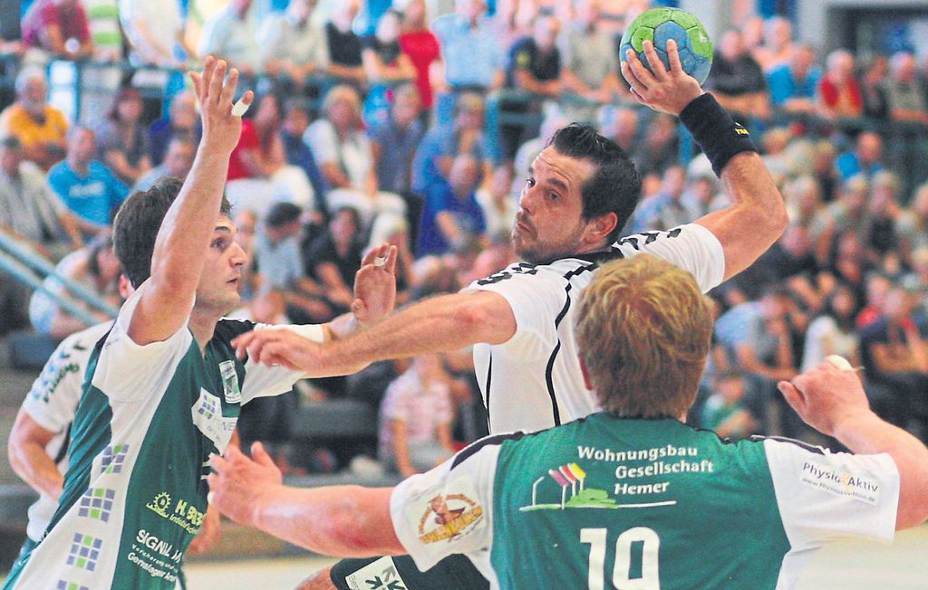 Kreisläufer Sebastian Theise, hier beim Wurf, hat in der entscheidenen Phase des Spiels gleich zwei Siebenmeter verworfen. Für Spradow war am Samstag mehr drin als eine 27:32 Niederlage. Fotos: Sebastian Picht