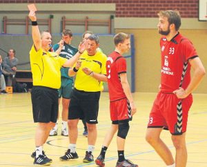 Die Schiedsrichter Gerigk/Gerigk aus Münster zeigen Tim Ahrend für ein Foul an Manuel Taubenheim die rote Karte.