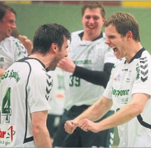 Malte Langer(rechts) und Dimitri Rausche schreiben die Freude über den Aufstieg heraus, auch Till Orgel und Frederik Iffland jubeln.