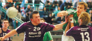 Mario Mylius quält sich zum Torerfolg, auch wenn sich zwei Gegenspieler des TuS Hartum in die Flugbahn des Balls werfen. Mylius erzielte fünf Treffer. Foto: Sebastian Picht