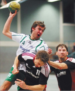 Der mit einer Verletzung an der Hand gehandicapte Dimitri Rausch (am Ball) räumt EURo-Spielertrainer Dirk Schnake aus dem Weg. Carsten Poggemeier ist schon geschlagen. Fotos: Sebastian Picht