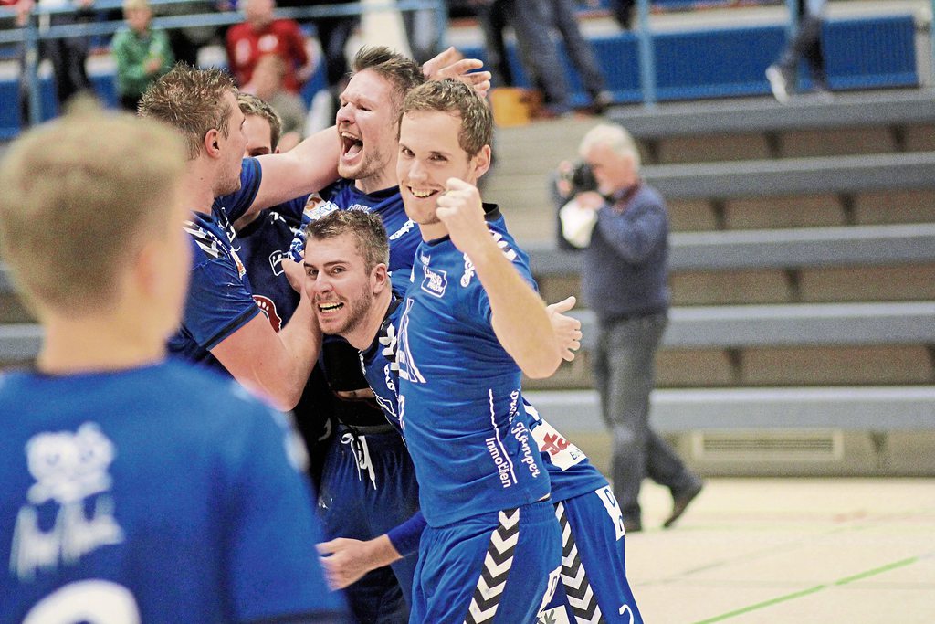 Große Freude und noch größere Erleichterung herrscht bei den Spradowern (von links) Frederik Iffland, Daniel Danowsky, Julian Peitzmeier und Daniel Langer nach dem überraschenden ersten Saisonsieg gegen LIT Handball II. Foto: Gerrit Nolte